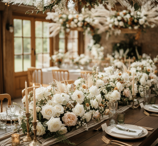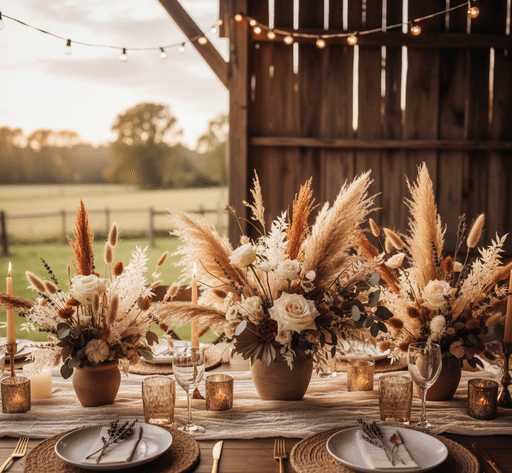 Fleurs séchées, pampas, tons naturels et bougies dorées : ce style reste incontournable.